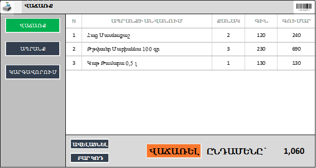 Փոքր խանութներին և կրպակներին, որոնք կանգնած են լուրջ խնդիրների առաջ կապված ՀԴՄ կտրոնի վրա ապրանքների անունները տպելու հետ, սակայն չունեն միջոցներ համապատասխան ծրագրերի և տեխնիկայի ձեռքբերման համար, մենք առաջարկում ենք ՄՈԲԻՍԵՅԼ հավելվածը, որի միջոցով Դուք հեշտությամբ հավաքում եք վաճառվող ապրանքների տեսականին Ձեր հեռախոսում կամ պլանշետում և տպում ՀԴՄ կտրոնը: